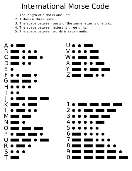 takes a total of 131 blinks! Just to spell letters further down the alphabet like Y, take 25 blinks! With this many blinks, its easy to miscount, it takes longer to send a message, etc, this system has lots of flaws. So you think surely someone has had this problem before, so you hit the books and find Morse code. Unlike your system which only had 1 kind of blink that you count, Morse code is made of two different kinds of blinks, a short blink, and a long blink(represented by a dash), and letters are comprised of patterns of the two.